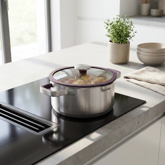Eine geräumige 24-cm-Edelstahlpfanne, die Familienmahlzeiten, Eintöpfe und großzügige Portionen mühelos bewältigt.